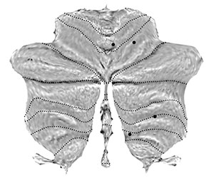 As part of the SUIT toolbox, we have developed a flat representation of the human cerebellum that can be used to visualise imaging data after volume-based normalisation and averaging across subjects. The method uses an approximate outer (grey-matter) and inner (white-matter) surface defined on the SUIT template (see figure to the left). Functional data between these two surfaces is projected to the surface along the lines connecting corresponding vertices. By applying cuts (thick black lines) the surface could be flattened out (bottom). We aimed to retain a roughly proportional relationship between the surface area of the 2D-representation and the volume of the underlying cerebellar grey matter. The map allows users to visualise the activation state of the complete cerebellar grey matter in one concise view, equally revealing both the anterior-posterior (lobular) and medial-lateral organisation. To explore the flatmap in more detail, check out our online cerebellar atlas viewer .