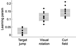 All of these are errors result in similar error correction. But when all perturbation are random, the brain only "learns" from errors induced by a visual rotation or a curl field, not from errors induced by target jumps. To show this, we estimated learning rates (see above) from the subject's behavior when exposed to random perturbations. Only when the motor system interpreted that it had done something wrong, did participants learn. When the error was caused by an external event (a target jump), the motor system did not learn. Note, however, that all subjects knew consciously that they are being perturbed by the robot and that these perturbations were random. |