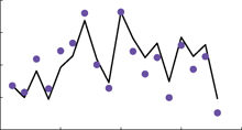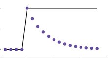For example, we might reach straight in the beginning of the experiment (z=0). When we suddenly put on prism glasses, so that we should reach 10 degrees to the right (u=+10, black line), we will first make an error (u-z) of ca. 10 degrees (cyan dots). By using the above learning rule, the error is decreased by fraction B on every trial, resulting in a approximately exponential learning curve. |